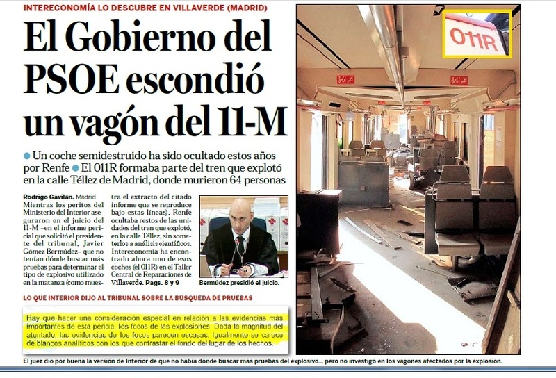 Manos Limpias solicita a Cillán que requiera a Renfe-Adif “toda la documentación existente sobre traslados, reparaciones y estancias en instalaciones de Renfe del vagón número 011R” componente del convoy de trenes que explotó en las inmediaciones de la calle Téllez el 11 de marzo de 2004 y del que, según los peritos químicos consultados por este periódico, pudieron extraerse en su día evidencias más que notables sobre las deflagraciones, especialmente si tenemos en cuenta que las pruebas presentadas durante el juicio (un total de 23 de las cientos que se recogieron en los focos) fueron consideradas por las partes insuficientes para dictaminar la autoría.