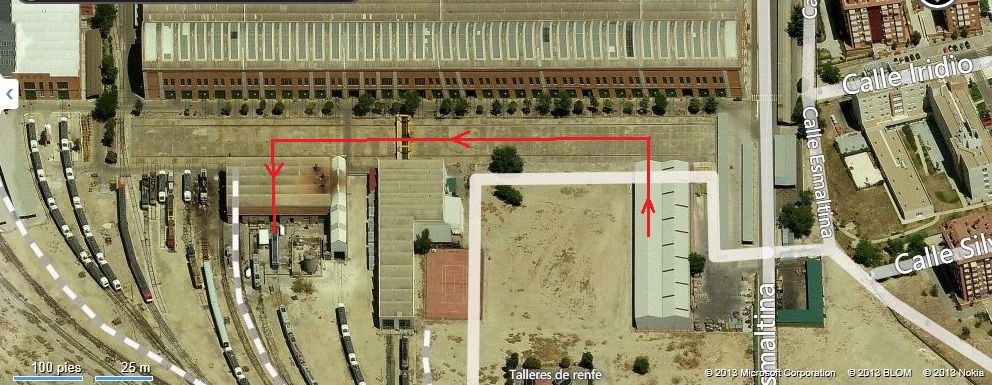 Itinerario seguido en el traslado del coche 2 de Téllez desde la nave en la que quedó inicialmente apartado hasta el lugar que tenía en enero de 2012. Un carro transbordador serviría para el traslado transversal