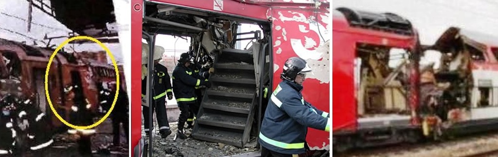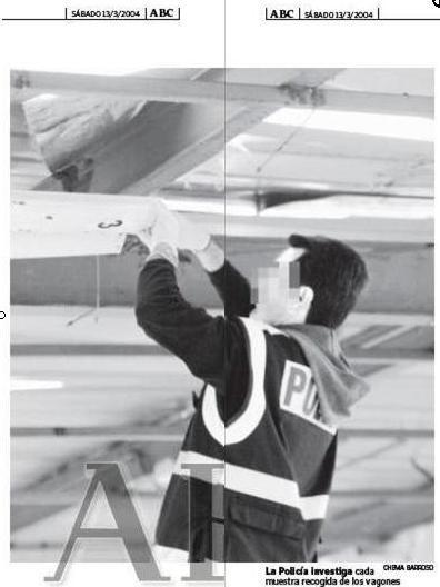 Y los policías no se limitaron a recoger indicios en el tren, también lo hicieron en el cráter abierto en el andén de la estación por la explosión controlada por los Tedax de una mochila extraída del coche 3. Pero El Pozo tiene además una característica muy especial y única entre los cuatro escenarios del atentado, y es la presencia de una marquesina prácticamente encima y muy cerca de uno de los focos de explosión. Y también, lógicamente, esa marquesina fue sometida a la investigación policial. Policías enguantados recogieron también indicios en esa marquesina, como lo prueban las fotos publicadas en aquellos días por medios tales como el diario ABC. Y si se investigó lo que quedaba en el techo, cuánto más no se haría en todo el material del propio tren próximo a los focos de explosión.