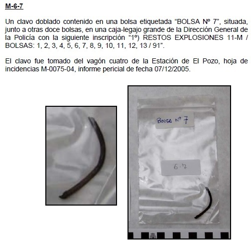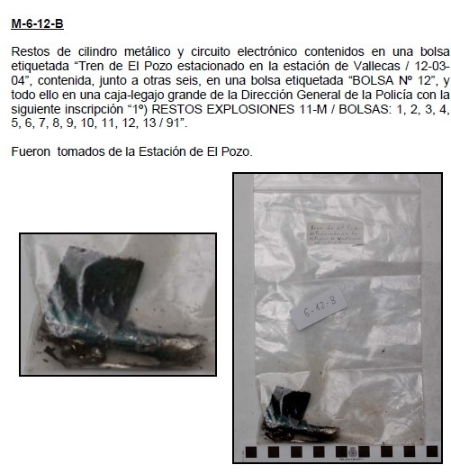 En esta relación de muestras vemos que hay dos tipos bien diferenciados, por un lado, los clavos de las muestras 6-7 y 6-8, y por otro diversos elementos que por su naturaleza, podrían haber formado parte de los artefactos explosivos, que son las siguientes: 6-12-A, trozo de bolsa de tejido azul con cremallera, 6-12-B, restos de cilindro metálico y circuito electrónico, 6-12-C, pila de petaca, 6-12-D, escamas de color azul, bobina eléctrica y piezas metálicas, 6-12-E, fragmentos de lo que parece un teléfono móvil. 6-12-F, hebilla y fragmentos de plástico. 6-12-G, un cargador y una batería de 3,6 V.