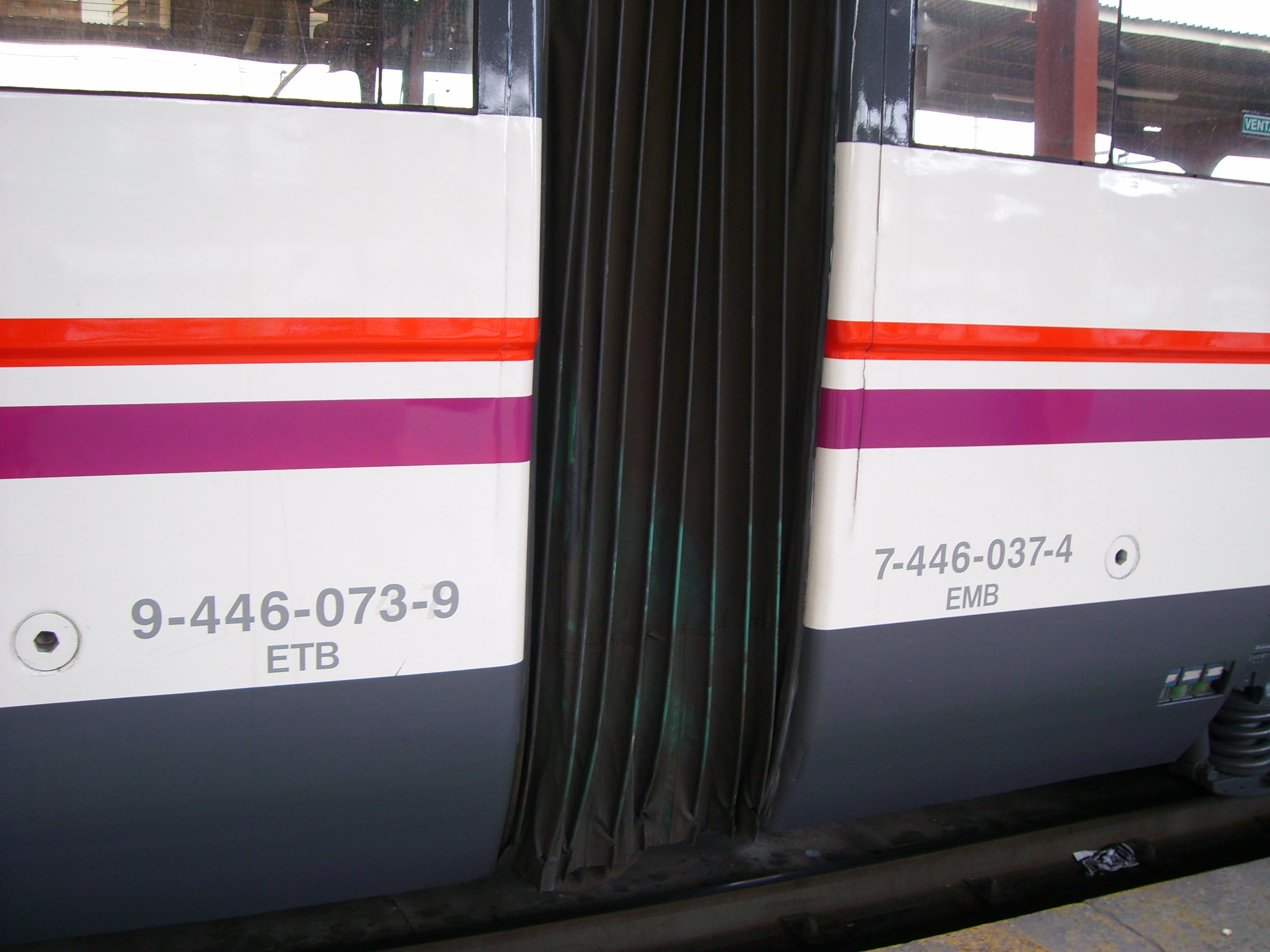 Cada coche lleva un número de 8 cifras escrito en su parte baja, las dos cifras de los extremos son cifras características del tipo de coche; a los efectos de identificación, son más importantes las seis cifras centrales. Las tres primeras corresponden a la serie del tren, en nuestro caso 446, mientras que las otras tres forman el número distintivo de cada coche. Este último número de tres cifras, simplificado y en mayores caracteres, va escrito en un extremo de cada coche y en su parte alta. A continuación de las tres cifras lleva la letra M, en los coches motores, y la R en los remolques.