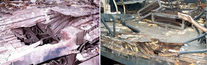 Y se incluye un esquema en el que por primera vez, al tercer intento, se sitúa la bomba en planta en el sitio correcto, aunque en alzado se mantiene una y otra vez, desde la inspección ocular, la ubicación en alto, en la bandeja portaequipajes, y una vez más se ignora la presencia de ese importante cráter que, por lo menos, merecería ser citado y aclarado por qué, a pesar de su existencia, y en contra de lo ocurrido con los otros 6 cráteres detectados, se sitúa la bomba en alto.