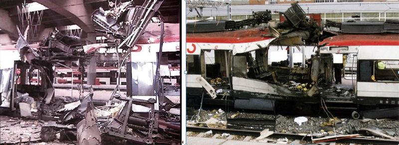El tren de cercanías número 190 M, procedente de Alcalá de Henares dirección a la Estación de Atocha, compuesto por seis coches ……, se encontraba en la tercera vía y en el interior del cuarto coche en el centro del mismo y en la parte superior de los tres asientos laterales hizo explosión una mochila.