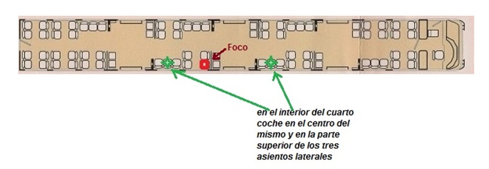 El artefacto había sido colocado en el portaequipajes del costado derecho del tren, sobre la zona de asientos ubicada entre las puertas 2 y 3.