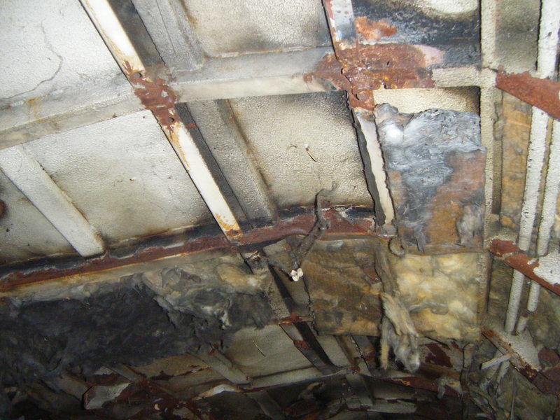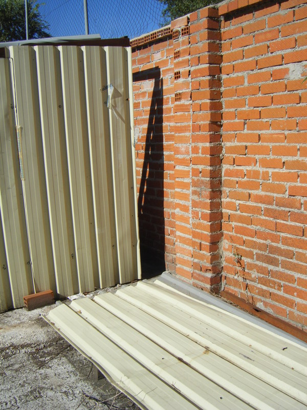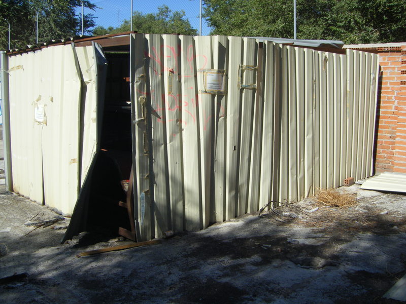 7 de octubre de 2013. Carteles de peligro de desprendimiento en las puertas del taller y ampliado el agujero inicialmente abierto en la chapa