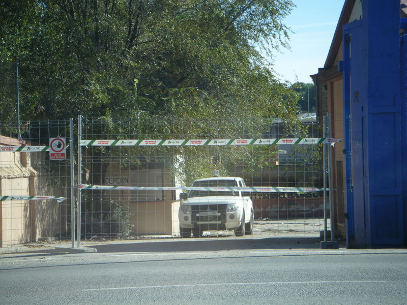 – Ha desaparecido de pronto toda la actividad saqueadora. La entrada a los talleres aparece de nuevo cerrada, esta vez con una valla de reja metálica, tras ella, unos agentes de seguridad de Adif, con su vehículo, vigilan el acceso.