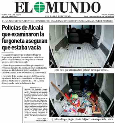 El «hallazgo» de la furgoneta, las características de la misma, y la polémica sobre su contenido resultan sorprendentes en un indicio criminal que no debería causar tanto revuelo. Desde luego, resulta imposible no extrañarse de que unos terroristas viajen en un coche robado, con la matrícula grabada en las bases de datos policiales, cargados -al menos- con 3 bolsas de 10 kilos cada una, conteniendo explosivos, metralla y temporizadores ya programados, y además con esos aires sospechosos que no pasaron desapercibidos a un portero recién levantado de la cama. En éste país estamos acostumbrados a que los malos utilicen placas falsas con los coches robados. Pero en fin…